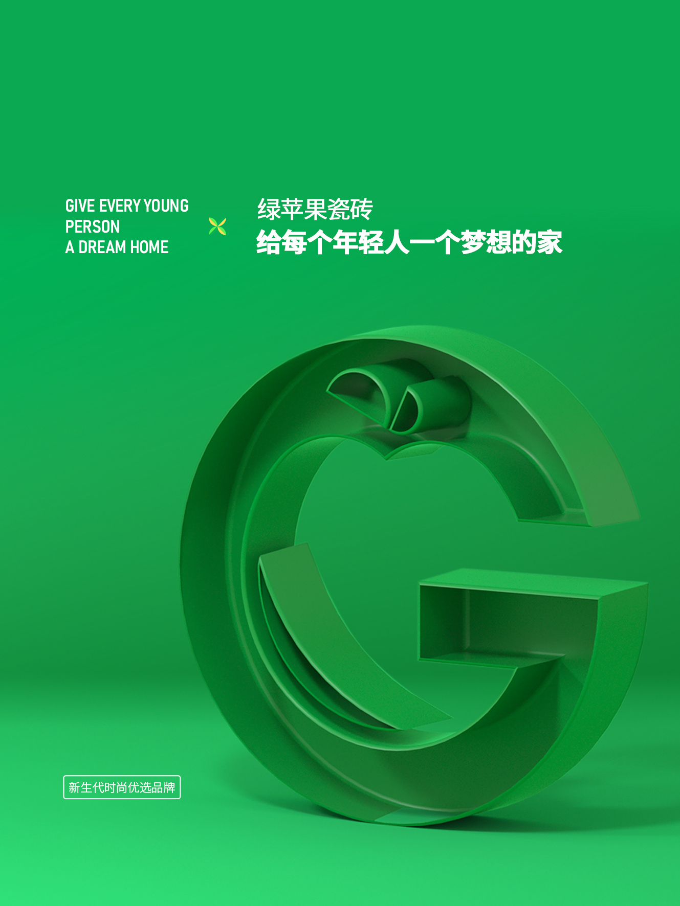 新生代品牌瓷磚綠蘋(píng)果瓷磚GREEN APPLE 始于2010年,糅合潮流元素與多變格調(diào),優(yōu)選品質(zhì)好物,用顛覆創(chuàng)新的思維去組合夢(mèng)想空間,打造時(shí)尚、激情、富有情感互動(dòng)的理想家,其中張揚(yáng)著年輕、奮斗和快樂(lè)的DNA。產(chǎn)品集合國(guó)際潮流色彩,以“給每個(gè)年輕人一個(gè)夢(mèng)想的家”為品牌使命,傳遞正青春的簡(jiǎn)單理念和細(xì)膩入微的質(zhì)感精神。